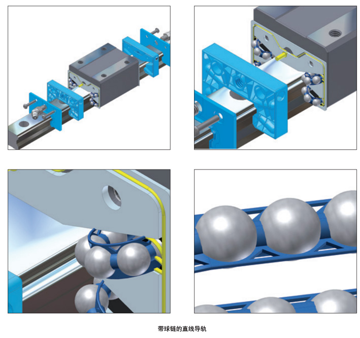 用于引導(dǎo)滾動元件的保持架已經(jīng)在滾柱軸承中使用了100多年,也是新開發(fā)的線性導(dǎo)軌的一部分。帶球鏈的線性導(dǎo)軌與傳統(tǒng)系列的不同之處在于: