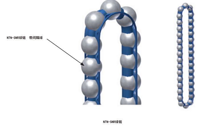 帶有滾珠鏈的直線導(dǎo)軌中的鏈條具有保持架的功能。它使球彼此保持恒定的距離,并控制它們的循環(huán)。車廂的結(jié)構(gòu)使其不可能實現(xiàn)封閉的球鏈循環(huán)。在球鏈的末端,保留約1個球直徑的空間。NTN-SNR球鏈末端的設(shè)計和間隔球的使用彌補了這一空間(如下圖)。