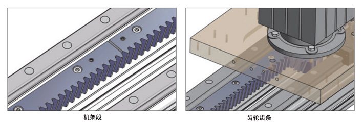 帶齒輪齒條傳動的線性軸具有非常高的可靠性,因此特別適合垂直應用??梢耘帕腥我鈹盗康臋C架段(如下圖左)。感應硬化機架和小齒輪(如下圖右)確保了很長的使用壽命。