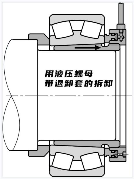 錐形孔軸承的拆卸如下圖所示,通過擰松緊固螺母,在內(nèi)圈上放置一個(gè)金屬塊,并用錘子敲擊,拆下使用適配器套筒安裝的小軸承,通過使用液壓拆卸方式,可以方便地使用適配器套筒或拆卸套筒拆卸安裝在錐形軸上的大型軸承。