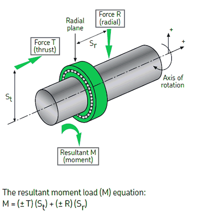 Kaydon軸承支撐軸或外殼,以允許其圍繞旋轉軸自由運動,載荷可以在兩個基本方向中的任何一個方向施加到軸承上,徑向載荷以直角作用于軸(軸承的旋轉軸)上,軸向(推力)與旋轉軸平行,當這些載荷偏離軸承軸(距離St)或徑向平面(距離Sr)時,將產生力矩載荷(M)。