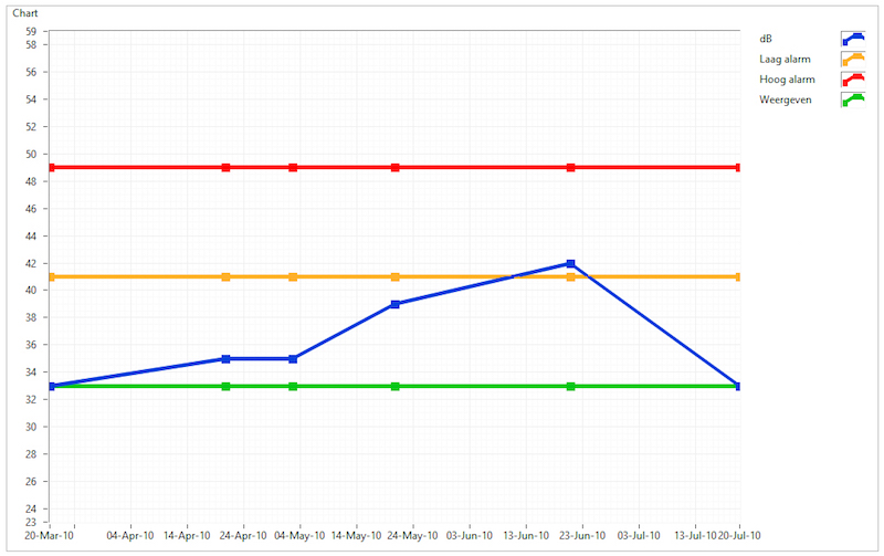 圖4,軸承潤滑歷史。該圖顯示了在驅動軸承上測量的分貝測量趨勢,根據基線dB(綠色)、低報警電平(黃色)和極高報警電平(紅色)顯示測量值。