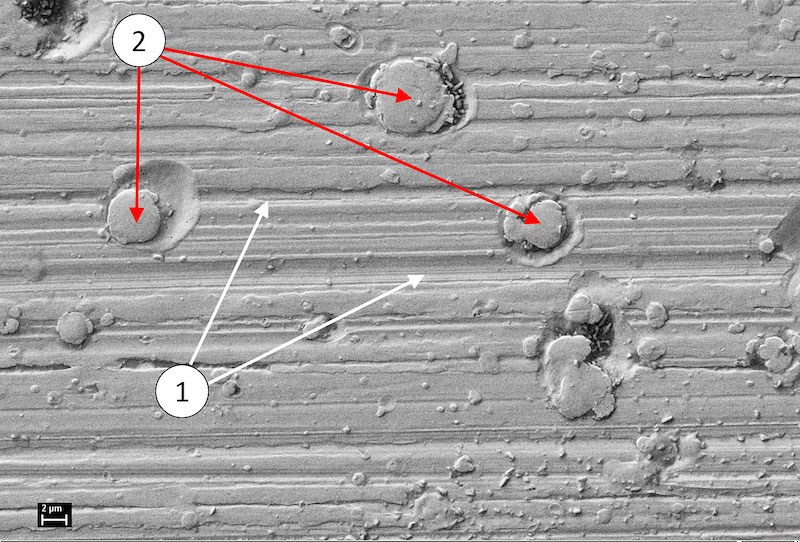 此時就會損壞軸承,滾道的接觸面局部熔化,該區域的鋼材質發生變化,這會以滾道和潤滑劑損壞的形式對軸承性能產生負面影響,并導致磨損增加及軸承振動增加,如上圖(由于有害的電流通過,深溝球軸承的外圈滾道損壞成磨砂滾道)和下圖(有害電流通過導致的帶有微坑的軸承表面圖像,①為表面處理痕跡,②為微坑)所示,顯示了EDM電流的影響,由于高頻電流,軸承表面呈現出微小的凹坑,這種損壞在當今使用變頻器應用中非常常見。