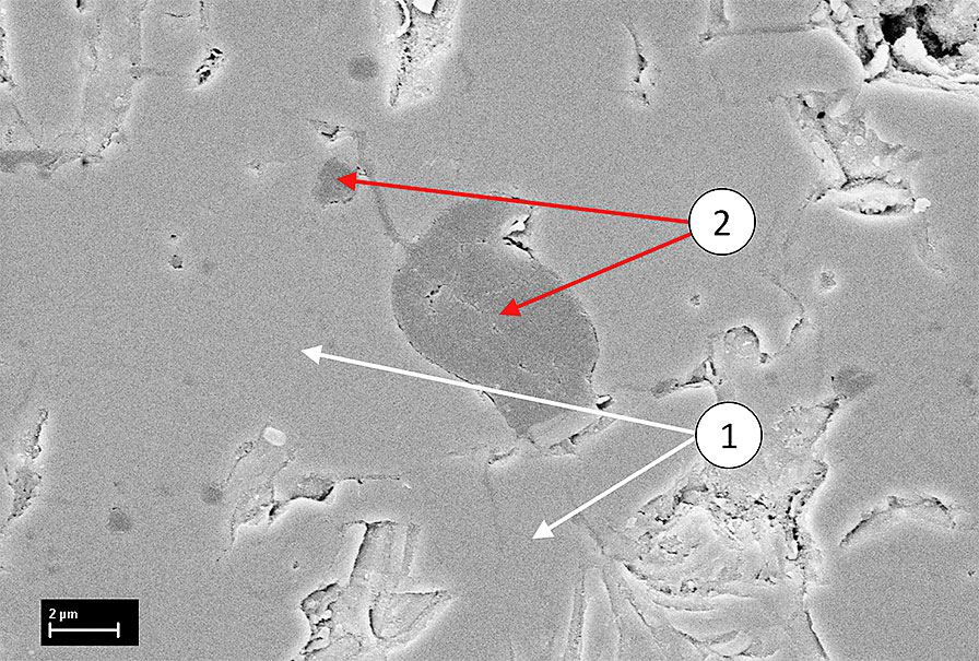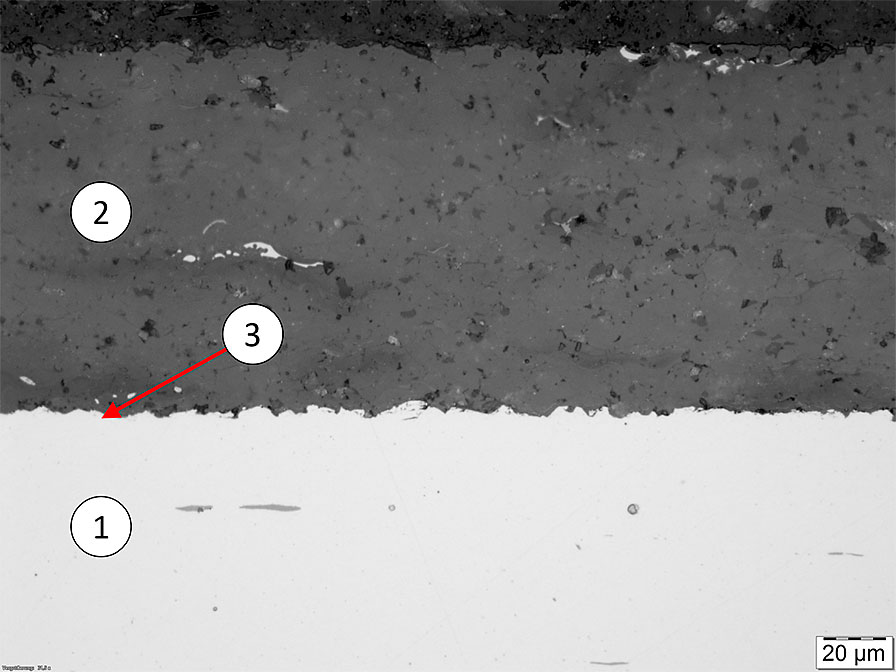 在噴涂過程之后,涂層具有一定數量的開口和互連的孔隙,這是熱噴涂涂層的一般特性,孔的數量和外觀強烈依賴于涂覆工藝的參數,氣孔在熱噴涂過程中起著核心作用,降低了腐蝕風險,改善了機械性能,并保持了絕緣性能恒定(在潮濕環境中非常重要),下圖顯示了一個封閉氣孔的示例(熱噴涂層結構的SEM圖像,可見絕緣涂層的封閉孔),圖中①為氧化物材料,②為密封孔。