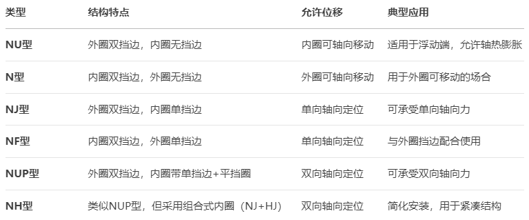 單列圓柱滾子軸承主要用于承受高徑向載荷,適用于高速旋轉(zhuǎn)場(chǎng)合,其滾動(dòng)體與滾道呈線接觸,具有較高的剛性和承載能力。根據(jù)內(nèi)、外圈擋邊結(jié)構(gòu)的不同,主要分為NU、N、NJ、NF、NUP、NH等類型,每種類型的結(jié)構(gòu)和適用工況有所區(qū)別。