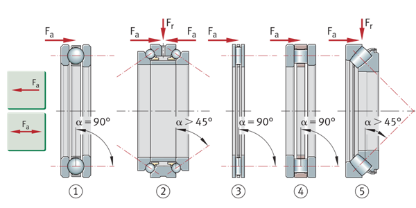 如果軸向載荷分量過高,也可以通過單獨的軸承來支撐軸向載荷。除了純軸向軸承外,使用徑向軸承(如深溝球軸承和圓柱滾子軸承或四點接觸軸承)可以在兩個方向上支撐軸向力。