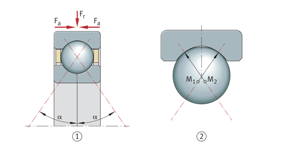 基本設(shè)計(jì)的四點(diǎn)接觸球軸承 α=標(biāo)稱接觸角 M1,M2=外圈滾道的曲率中心 Fr=徑向載荷 Fa=軸向載荷 四點(diǎn)接觸球軸承,剖分式內(nèi)圈,外圈沒有固定槽 | ![]() |