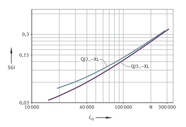 SGI值基于內(nèi)部標(biāo)準(zhǔn)中軸承的最大允許噪聲水平,該標(biāo)準(zhǔn)是根據(jù)ISO 15242計(jì)算得出的。為了能夠比較不同的軸承類型和系列,將SGI值與基本額定靜載荷C0進(jìn)行對比。