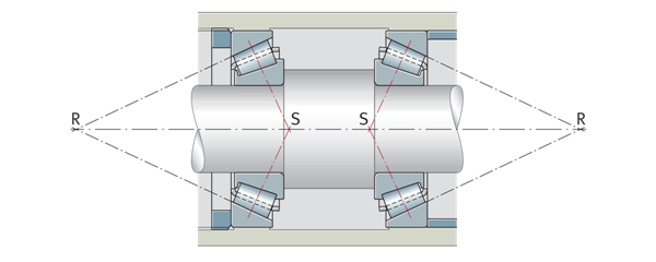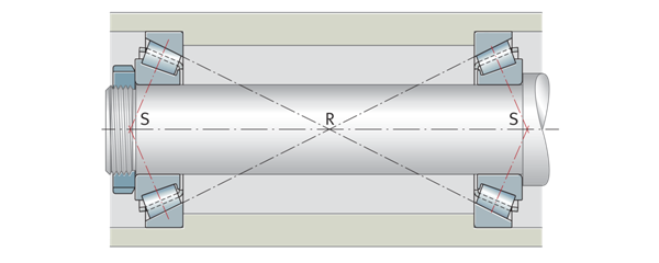 在決定O和X排列時,還必須注意溫度條件和熱膨脹。這是基于圓錐滾子頂點R的位置。圓錐滾子頂點代表延伸的傾斜外圈滾道與軸承軸線的交點