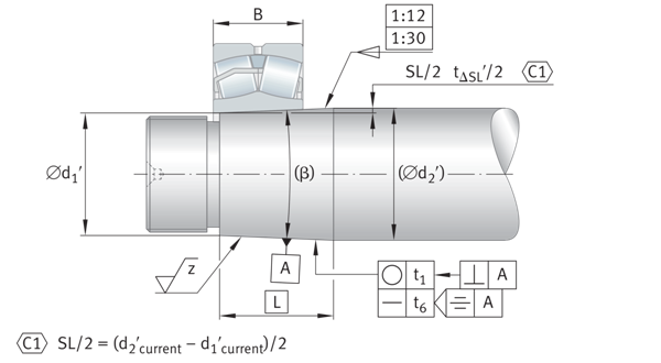 在角接觸球軸承和圓錐滾子軸承中,滾動元件力的接觸線在接觸圓錐頂點S處重合,在調整后的軸承布置中,軸承間距因此定義為接觸錐頂點的間距。