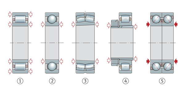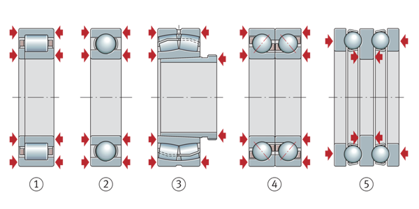 例如,雙列角接觸球軸承將比深溝球軸承或調心滾子軸承提供更緊密的軸向導向。一對對稱布置的角接觸球軸承或用作定位軸承的圓錐滾子軸承也可提供非常緊密的軸向引導。