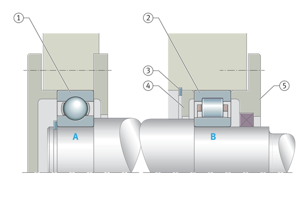 對于浮動軸承布置,幾乎所有軸承類型都可以考慮,不得進行調整。例如深溝球軸承、自調心球軸承和調心滾子軸承,兩個軸承中每個軸承的一個套圈(通常是外圈)都有一個滑動座。在具有圓柱滾子軸承NJ的浮動軸承布置中,可以在軸承內進行長度補償。
