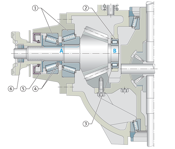 圖中的定位軸承在兩個方向上都受到較高的軸向力,軸必須在軸向上無間隙地引導。