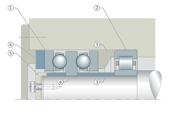 雙向軸向深溝球軸承的軸定位墊圈和圓柱滾子軸承的內圈通過端墊圈軸向夾緊。軸向深溝球軸承通過插入配合的中間環進行無間隙調整。