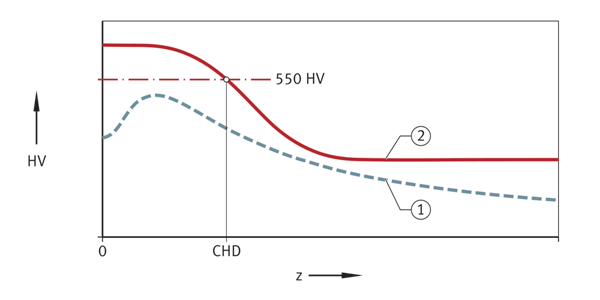 根據DIN EN ISO 15787:2010,硬化深度是指仍具有550 HV1硬度的硬化表面區域的深度。它是在精加工軸上測量的,必須符合規定值,但在任何情況下都必須≥0.3 mm。