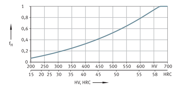 如果滾道滿足滾動軸承材料的要求,但其硬度值小于670 HV(58 HRC),則軸承布置上的載荷不能高達軸承的全承載能力。為了確定承載能力,必須將軸承的基本額定動載荷C乘以折減系數fH,將基本額定靜載荷C0r乘以折減因子fH0