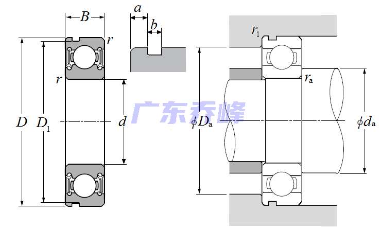 | 單列深溝球軸承 - 雙面密封(接觸式橡膠密封),帶止動環槽 - 尺寸 | |