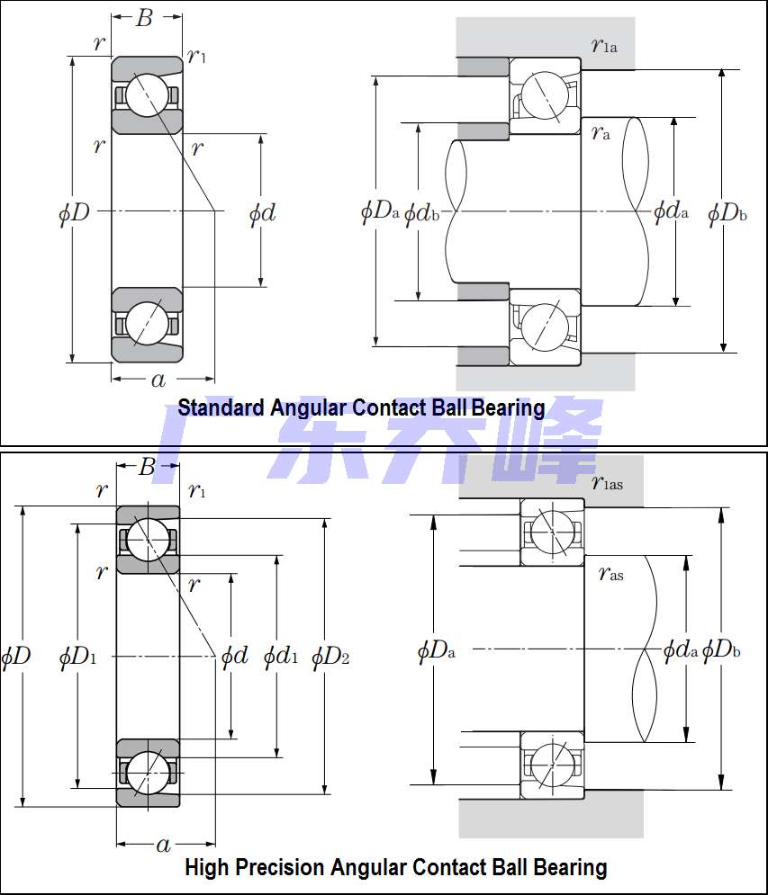 | 單列角接觸球軸承 - 開式 - 尺寸 | |