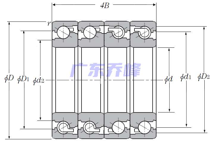 滾珠絲杠用四列角接觸推力球軸承 - DTFT配對,開式,兩排承受軸向載荷 - 尺寸
