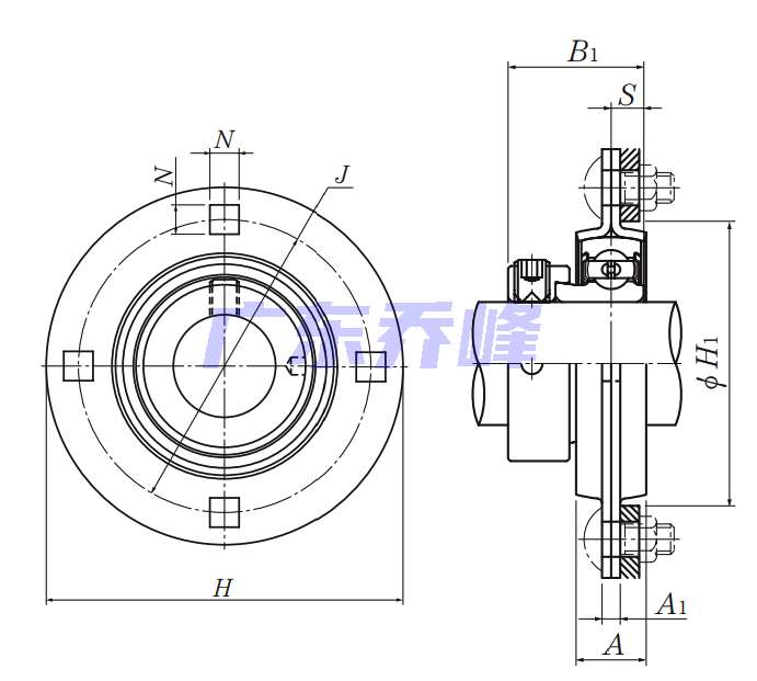 軸承型號:JELPF208-108,四螺栓圓形法蘭式軸承座,沖壓鋼外殼,帶偏心鎖緊套,JELPF型