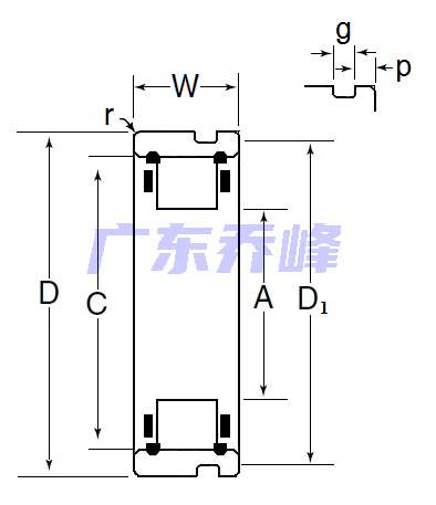 | 帶保持架和滾子的外圈,兩個擋圈&帶止動環槽 in外圈 O.D. - 尺寸 | |