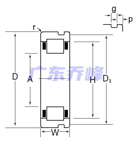 | 帶保持架和滾子的外圈,兩個加強筋&帶止動環槽 in外圈 O.D. - 尺寸 | |