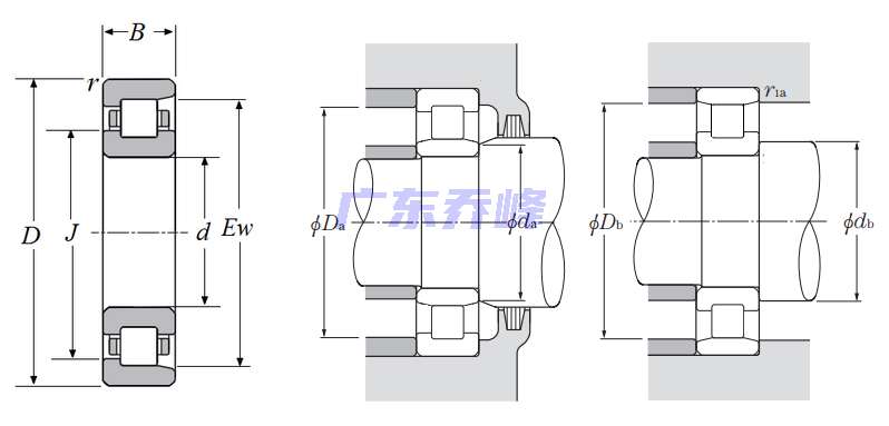 | 圓柱滾子軸承 -可分離型內圈帶兩個加強筋,外圈帶一個加強筋 - 尺寸 | |