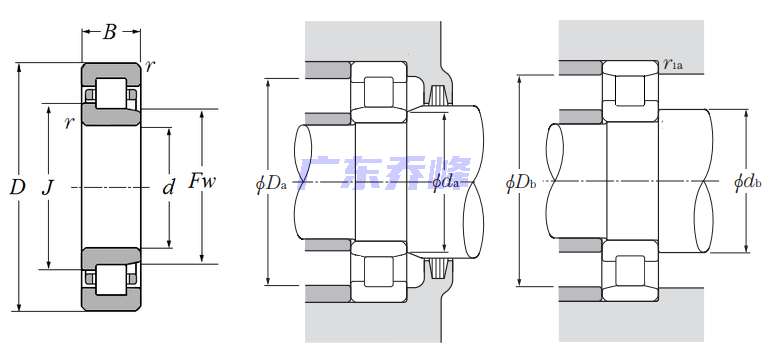 | 圓柱滾子軸承 -可分離型內(nèi)圈帶一個加強筋,外圈帶兩個加強筋 - NJ型 - 尺寸 | |