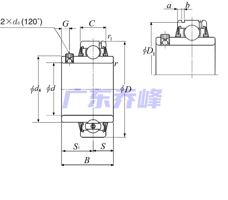 | 帶緊定螺釘的外球面軸承,寬外圈 - 圓柱內徑,帶止動環槽 - 尺寸 | |